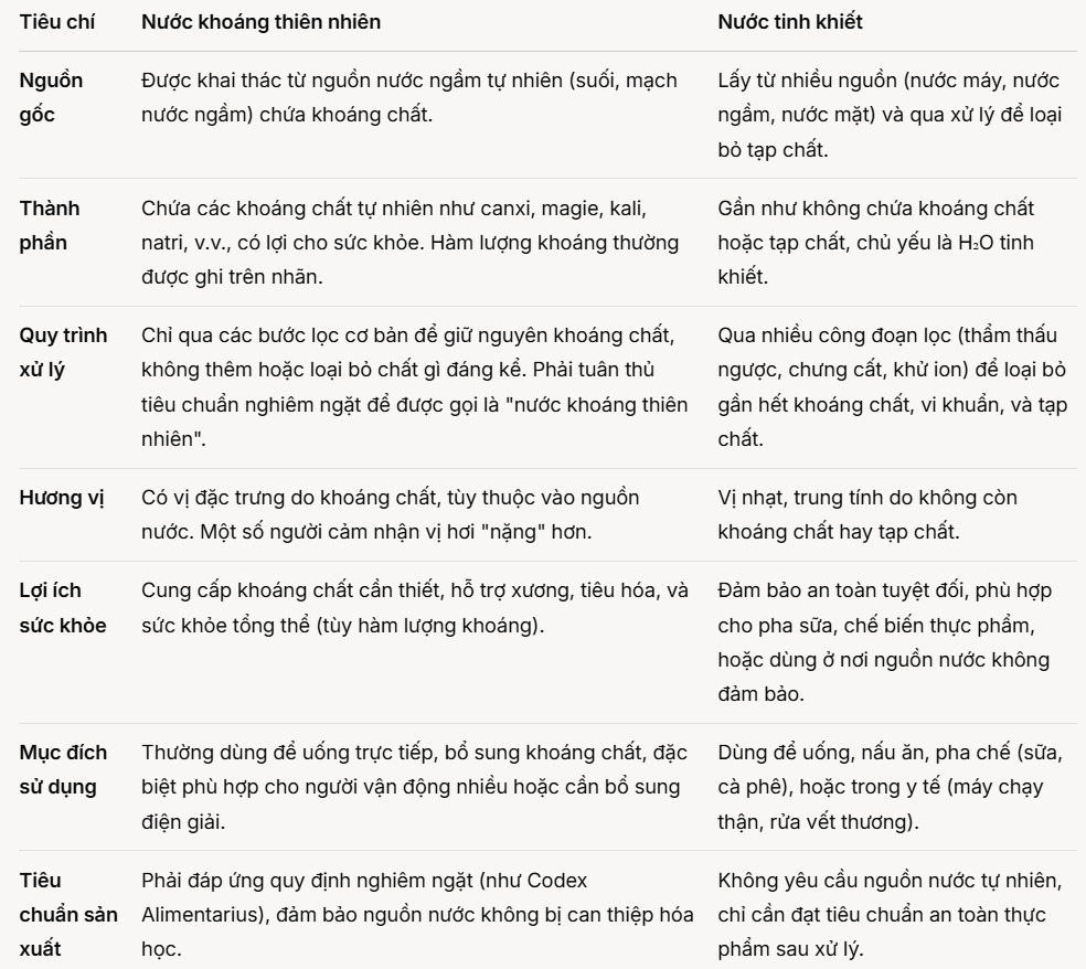 Lựa chọn nước khoáng thiên nhiên hay nước tinh khiết ? Vậy đâu là sự khác nhau giữa 2 loại nước này xét về nguồn gốc, thành phần, quy trình xử lý và mục đích sử dụng.